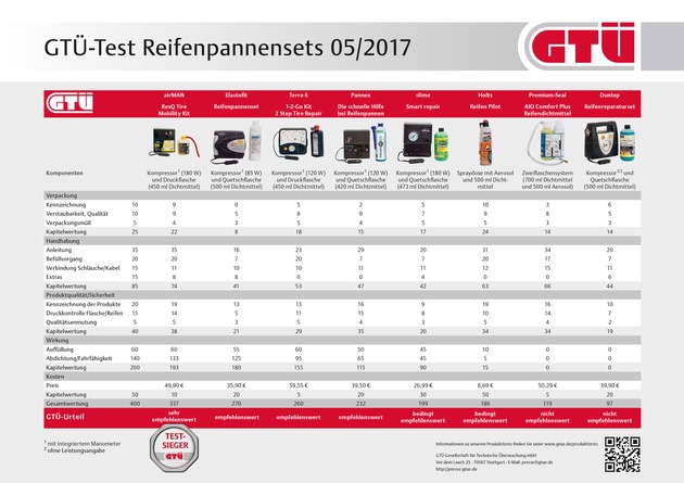 Auf den weiteren Plätzen folgen drei empfehlenswerte Pannensets, nämlich das Reifenpannenset von Elastofit sowie das 1-2-Go Kit 2 Step Tire Repair von Terra-S und Pannex - Die schnelle Hilfe bei Reifenpannen. Alle drei setzen ebenfalls auf die Kombination Kompressor und Dichtmittel wie auch das von den GTÜ-Testern als "bedingt empfehlenswert" eingestufte Smart repair von slime. Als ebenso "bedingt empfehlenswert" erwies sich der Reifen Pilot von Holts mit seiner klassischen Aerosol-Spraydose, die den defekten Reifen gleichzeitig mit Dichtmittel und Druck versorgen soll. Das AIO Comfort Plus Reifendichtmittel von Premium-Seal und Dunlops Reifenreparaturset erfüllten die Testkriterien nicht. Im Fall von Premium-Seal blockierte bei mehrfachen Versuchen jedes Mal nach wenigen Sekunden die Dichtmittelzufuhr, so dass sich der Reifen überhaupt nicht befüllen ließ und bei Dunlop reichte der maximale Druckaufbau von 0,6 bar schlicht nicht aus, um die Testfahrt antreten zu können.
