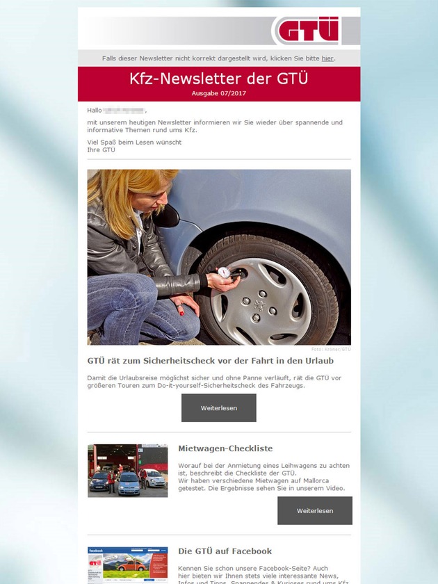 Die Prüf- und Sachverständigenorganisation GTÜ baut ihren Service für Endkunden weiter aus. Der neue Kfz-Newsletter informiert alle interessierten Autofahrerinnen und Autofahrer monatlich zu aktuellen Themen rund um die Mobilität. Im Mittelpunkt stehen dabei aktuelle Meldungen und Tipps, Produkt- und Reifentests, Hinweise zu GTÜ-TV, Ratgeber und Checklisten, rechtliche Neuerungen, Kuriositäten sowie Termine und Veranstaltungen.