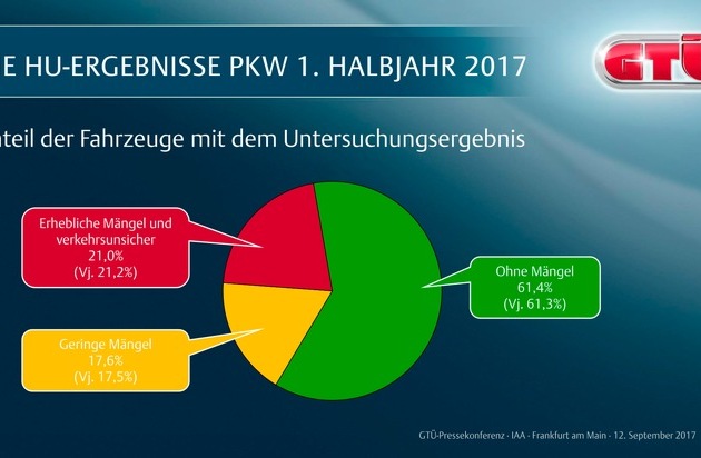 Immer mehr Pkw bestehen die amtliche Hauptuntersuchung ohne Beanstandung, die Zahl der Fahrzeuge mit schwerwiegenden technischen Mängeln nimmt leicht ab. Diesen erfreulichen Trend bei der amtlichen Fahrzeuguntersuchung konnte die GTÜ Gesellschaft für Technische Überwachung auf der IAA in Frankfurt am Main vermelden.