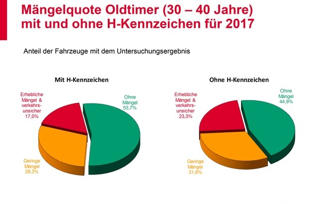 Zum Vergleich: Bei den Oldtimern ohne H-Kennzeichen liegt die Mängelzahl der Fahrzeuge mit über 55 Prozent deutlich höher. Mit "geringen Mängeln" sind hier 31,8 Prozent und mit "erheblichen Mängeln" 23,3 Prozent der Klassiker unterwegs. 44,9 Prozent absolvieren die Hauptuntersuchung "ohne erkennbare Mängel".