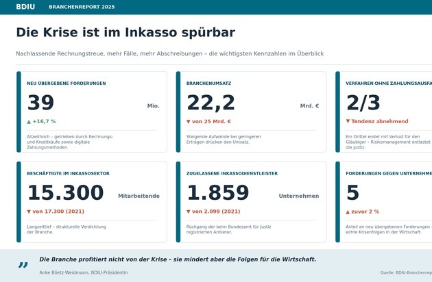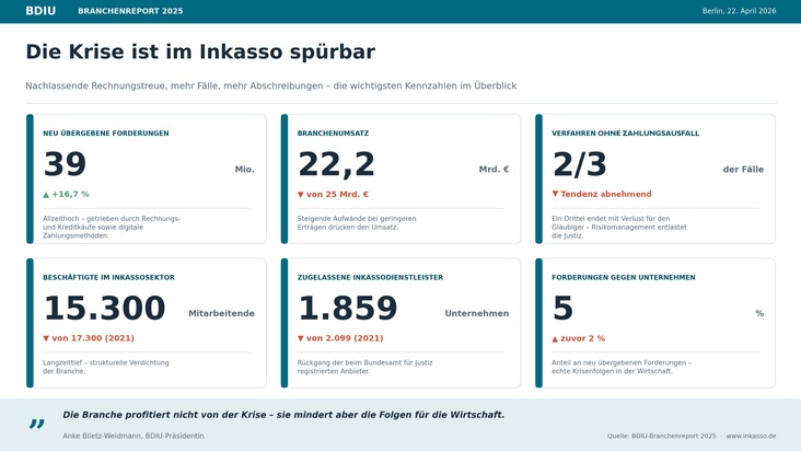 Laut Branchenreport 2025 des Bundesverbands Deutscher Inkasso-Unternehmen e. V. (BDIU) war der Bedarf an rechtlicher Beratung durch Inkassodienstleister nie größer. "Die Anzahl der neu übergebenen Fälle ins Inkasso steht auf einem Allzeithoch. Das resultiert aus der hohen Nachfrage der Verbraucher an Rechnungs- und Kreditkäufen sowie digitalen Zahlungsmethoden auch bei Kleinstbeträgen. Echte Krisenfolgen sehen wir hingegen bei den verzugsbefindlichen Forderungen gegen Unternehmen", sagt BDIU-Präsidentin Anke Blietz-Weidmann. Für die Wirtschaft werde fehlende Rechnungstreue zum Problem, die Krise habe das Inkasso erreicht.