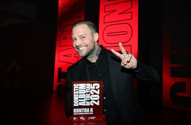 Mit "Augen träumen Herzen sehen" sicherte sich Kontra K den Titel "Domestic Album of the Year". Das Werk war 2025 das erfolgreichste deutsche Album und zugleich das erfolgreichste Hip-Hop-Album des Jahres. Insgesamt kommt Kontra K in Deutschland auf 4,2 Milliarden Streams, davon 475 Millionen im Jahr 2025. "Augen träumen Herzen sehen" markiert bereits sein neuntes Nummer-1-Album und unterstreicht seine außergewöhnliche Kontinuität: Kontra K stand bislang 387 Wochen in den Album-Charts und zählt zu den prägendsten deutschen Künstlern seiner Generation. Die Laudatio hielten Nico Santos und Vincent "Beatzarre" Stein von der Band SDP.