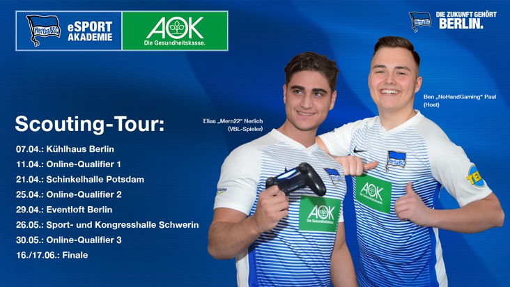 Berlin - Am Samstag, den 7. April 2018, startet die große Scouting-Tour der eSport-Akademie von Hertha BSC in Zusammenarbeit mit der AOK Nordost. FIFA18-Talente aus Berlin, Brandenburg und Mecklenburg-Vorpommern können sich bei Off- und Online-Turnieren für die Plätze in der ersten eSport-Akademie in der Bundesliga empfehlen. Die erste Veranstaltung findet im Kühlhaus Berlin statt.