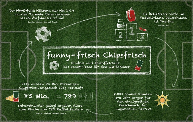 Eine Weltmeisterschaft ohne Kartoffelchips ist kaum vorstellbar. funny-frisch Chipsfrisch, die beliebteste Kartoffelchips-Marke Deutschlands, feiert in diesem Jahr ihr 50-jähriges Jubiläum. Gemeinsam mit den Markenbotschaftern und amtierenden Weltmeistern Bastian Schweinsteiger und Lukas Podolski fiebert funny-frisch der Mission Titelverteidigung entgegen und freut sich auf die nächsten 50 Jahre Chipsfrisch-Genuss.