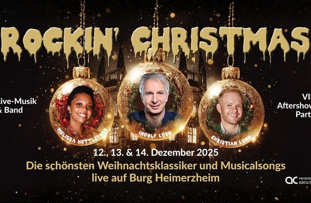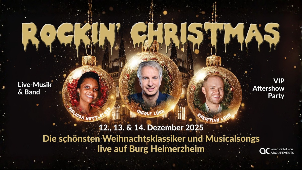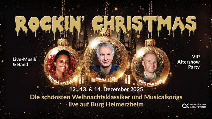 Von wegen stille Nacht! I'm dreaming of...A ROCKIN' CHRISTMAS! Für dieses besondere Vorweihnachts-Erlebnis verwandelt sich die festlich geschmückte Burg Heimerzheim nahe Köln und Bonn drei Tage lang in eine einzigartige Gala-Location. Vom 12. bis 14. Dezember 2025 können hier Musicalfans, Familien und Liebhaber:innen magischer Abende eine Show erleben, in der die internationalen Künstler:innen Melissa Nettleford und Christian Lunn der musikalische Mittelpunkt sind.