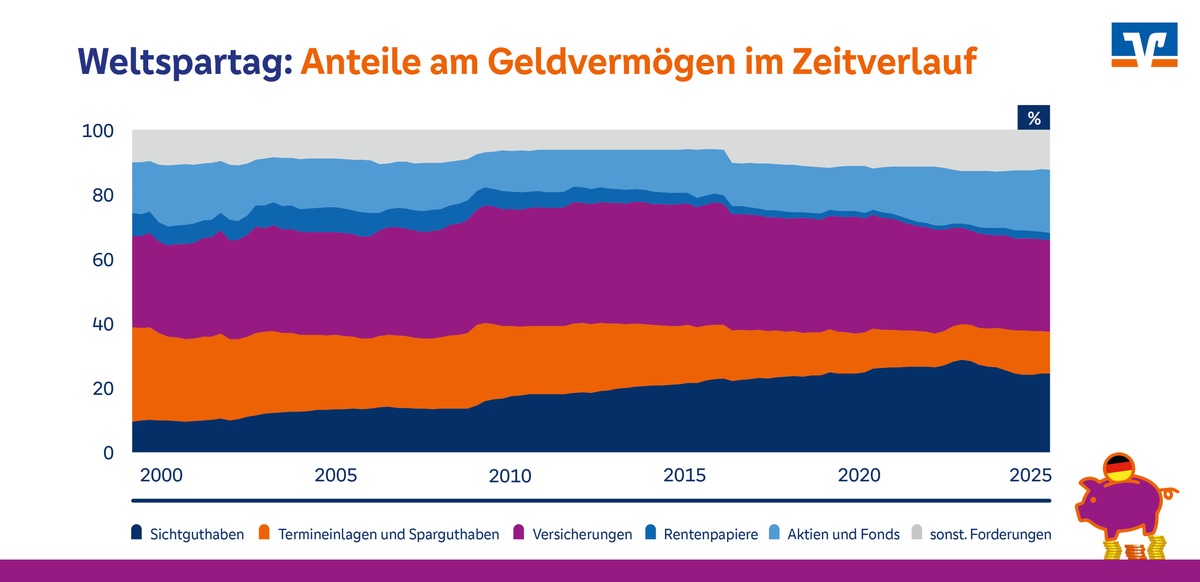 Zum 101. Weltspartag zeigt sich beim Blick auf die Spargewohnheiten der Deutschen ein differenziertes Bild: Das Sparbewusstsein in der Bevölkerung ist hoch - viele Menschen erkennen die Notwendigkeit, Rücklagen zu bilden. Gleichzeitig liegt die vom Bundesverband der Deutschen Volksbanken und Raiffeisenbanken (BVR) prognostizierte Sparquote der privaten Haushalte für 2025 bei 10,4 Prozent und für 2026 bei 10,6 Prozent. Damit bewegt sie sich zwar im Bereich des langjährigen Durchschnitts und im internationalen Vergleich auf hohem Niveau, doch hinter der Zahl verbergen sich große Unterschiede zwischen den Altersgruppen und Einkommensschichten.