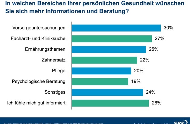 "Trotz der Informationsflut herrscht in Deutschland bei Gesundheitsfragen großer Informations- und Beratungsbedarf - die Umfrage hat es ganz deutlich gezeigt: Drei Viertel der Deutschen vermissen zuverlässige Orientierung. Dort setzt die SBK an: Wir können Wissenslücken schließen, Optionen aufzeigen und damit unseren Kunden zu guten Entscheidungen für ihre Gesundheit verhelfen."