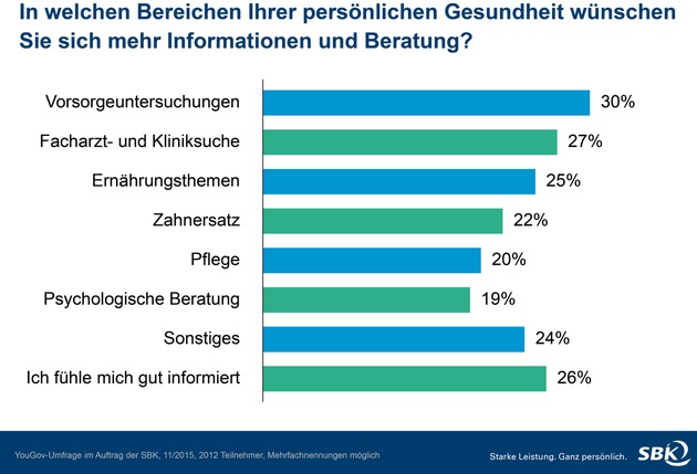 "Trotz der Informationsflut herrscht in Deutschland bei Gesundheitsfragen großer Informations- und Beratungsbedarf - die Umfrage hat es ganz deutlich gezeigt: Drei Viertel der Deutschen vermissen zuverlässige Orientierung. Dort setzt die SBK an: Wir können Wissenslücken schließen, Optionen aufzeigen und damit unseren Kunden zu guten Entscheidungen für ihre Gesundheit verhelfen."