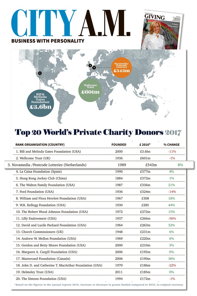 Großartige Nachrichten für Novamedia/Postcode Lotterien in den Niederlanden, Schweden, Großbritannien und Deutschland: Die britische Tageszeitung City A.M. listet die Soziallotterien in ihrer jährlichen Fundraising-Studie wieder auf Platz drei der weltweit größten privaten Spendengeber.