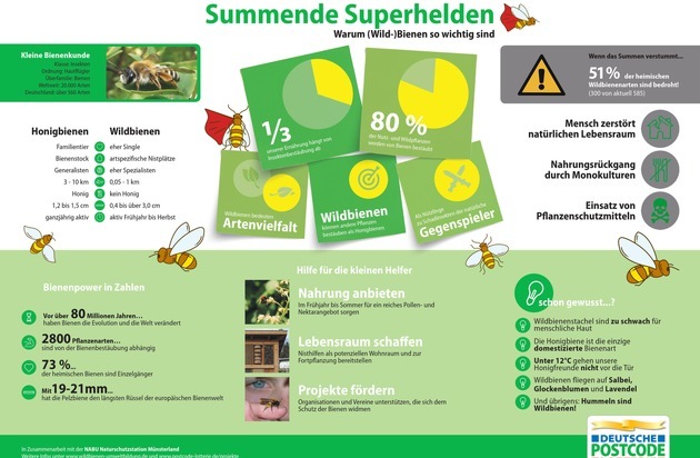 Spannende Fakten zu Biene und Wildbiene sind in der Infografik 'Summende Superhelden' und unter www.postcode-lotterie.de/weltbienentag zu finden, die in Zusammenarbeit mit der NABU-Naturstation Münsterland entstanden ist. Informationen zu Wildbienen und zum Projekt 'Deutschlands Wilde Bienchen' unter www.artenschutz-franken.de sowie unter www.wildbienen-umweltbildung.de und www.wildbiene.com. Und übrigens: Mit einem Los der Deutschen Postcode Lotterie tragen Teilnehmer zum Schutz des bedrohten Insekts bei. Von jedem Losbeitrag gehen 30 Prozent an Förderprojekte aus den Bereichen Natur- und Umweltschutz, sozialer Zusammenhalt und Chancengleichheit. Mehr unter www.postcode-lotterie.de.