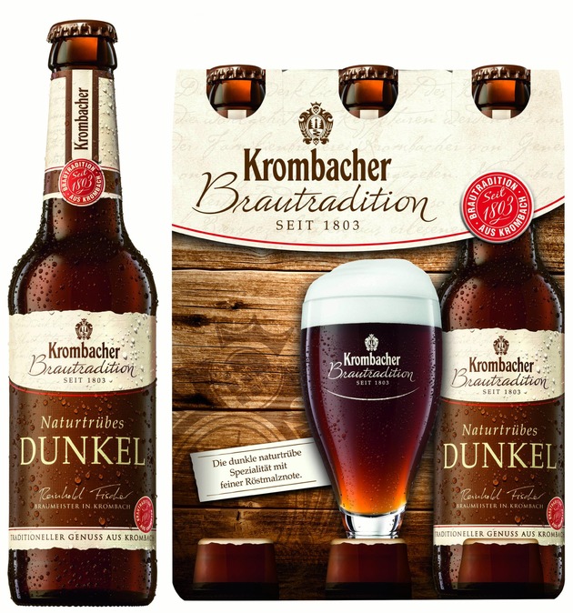 Viele Verbraucher wünschen sich traditionelle, ursprüngliche Geschmackserlebnisse. Sie wollen besondere Biere, die sie bewusst genießen. Dabei gewinnen vor allem naturtrübe Brauspezialitäten mit einzigartigem Charakter an Bedeutung. Die hohe Nachfrage der Verbraucher nach dem im März 2016 eingeführten Krombacher Brautradition Kellerbier hat die Erwartungen bei weitem übertroffen, daher war es nur konsequent mit der neuen Sorte Krombacher Brautradition Naturtrübes Dunkel den Markt zu bereichern. Mit Krombacher Brautradition bietet die Krombacher Brauerei eine Spezialitäten-Range für die Liebhaber besonderer Biere an und beweist einmal mehr, was für eine Bandbreite an Bierkreationen nach dem deutschen Reinheitsgebot möglich ist.