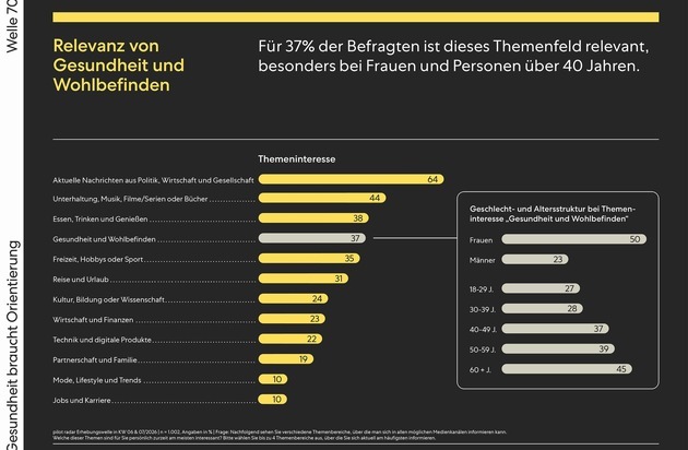 Hamburg, 23. März 2026. Das Thema Gesundheit und Wohlbefinden ist den Deutschen wichtig und zählt stabil zu den Top 4-Themenfeldern, mit denen sie sich in den Medien beschäftigen. Dies hat die Agenturgruppe pilot zum Anlass genommen, in der aktuellen 70. Welle der Studienreihe pilot radar einen detaillierten Blick auf aktuelle Entwicklungen in der Pharmabranche – insbesondere im OTC-Markt – zu werfen. Mit 37 Prozent liegt das Interesse für Gesundheitsthemen fast gleichauf mit Essen, Trinken und Genießen (38 Prozent) – noch vor Freizeit, Hobbys und Sport (35 Prozent) sowie Reisen und Urlaub (31 Prozent; siehe Grafik 1). An der Spitze dieses Rankings landen aktuelle Nachrichten aus Politik, Wirtschaft und Gesellschaft (64 Prozent) sowie auch Unterhaltung in Form von Musik, Serien/Filmen und Büchern (44 Prozent). Überdurchschnittlich ausgeprägt ist das Interesse an gesundheitlichen Themen vor allem bei Frauen (50 Prozent vs. Männer: 23 Prozent) und Personen über 40 Jahren, die sich über alle Medienkanäle hinweg, also via Internet, Zeitschriften, TV oder Radio entsprechend informieren. Auch die Ausgabebereitschaft im Kontext Gesundheit ist stabil und liegt mit 75 Prozent der Befragten, die bereit sind, in naher Zukunft mehr oder genauso viel Geld für Gesundheit/Fitness/Wellness auszugeben nur knapp hinter Körperpflege und Düfte (Rang 2: 77 Prozent) und Lebensmitteln und Getränken (Rang 1: 85 Prozent). Dies sind Ergebnisse der 70. Befragungswelle der Studienreihe pilot radar, die das Marktforschungsinstitut Norstat im Auftrag der Agenturgruppe pilot Anfang Februar erhoben hat, um den Werbetreibenden aktuelle Erkenntnisse zu Konsum und Einstellungen der Deutschen an die Hand zu geben