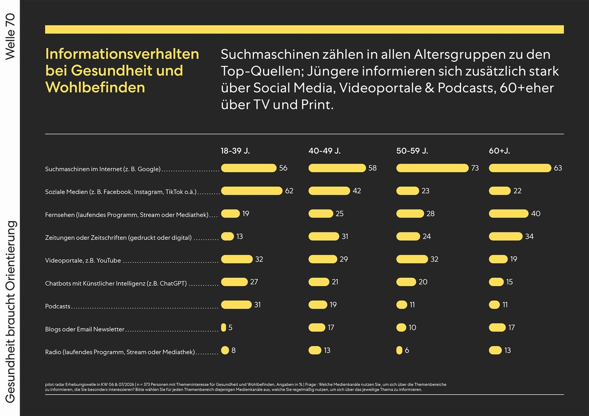 „Die Informationssuche im Gesundheitsbereich funktioniert heute wie ein Orchester verschiedener Medienkanäle“, erläutert Martina Vollbehr. „Suchmaschinen geben oft den ersten Impuls, aber Meinungen entstehen im Zusammenspiel mit Bewegtbild, klassischen Medien wie Print, Radio oder Podcasts sowie sozialen Plattformen – und das je nach Alter der Zielgruppe sehr unterschiedlich. Diesen Medienmix gilt es als Marketingverantwortliche aktiv zu gestalten.“