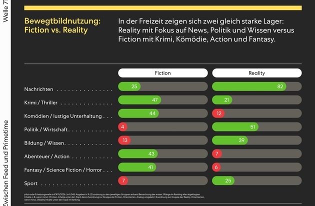 In dieser 71. Radar-Welle hat pilot vor allem das Thema Bewegtbild detailliert beleuchtet und die 87 Prozent der Befragten, die in ihrer Freizeit zu Hause eher oder sehr häufig Video-Inhalte wie lineares Fernsehen, Streamingdienste oder Mediatheken nutzen, nach ihren inhaltlichen Präferenzen geclustert. Daraus ergeben sich zwei trennscharf abgrenzbare, in etwa gleich große Gruppen von primär Fiction-Orientierten einerseits und primär Reality-Orientierten andererseits (siehe Grafik 1). Die Reality-Anhänger favorisieren vor allem aktuelle Nachrichten (82 Prozent) gefolgt von Inhalten zu Politik/Wirtschaft (51 Prozent), Bildung/Wissen (29 Prozent) und Sport (25 Prozent). Bei Fiction verteilen sich die Vorlieben weitestgehend gleichmäßig auf folgende Genres: Krimi/Thriller (47 Prozent), Komödien (44 Prozent), Abenteuer/Action (43 Prozent) und Fantasy (41 Prozent). Romantik spielt dagegen aktuell nur eine nachrangige Rolle (24 Prozent). Dabei besteht ein klarer Zusammenhang zwischen Lebensalter und inhaltlicher Orientierung: mit zunehmendem Alter nimmt die Reality-Orientierung zu (18-29J: 28 Prozent; 30-39J: 36 Prozent; 40-49J: 40 Prozent; 50-59J: 42 Prozent; 60+ Jahre: 55 Prozent). Umgekehrt ist die Fiction-Orientierung in jüngeren Altersgruppen signifikant stärker ausgeprägt (18-29J: 58 Prozent vs. 60+ Jahre: 32 Prozent). Zwischen den Geschlechtern besteht dagegen kein signifikanter Unterschied.