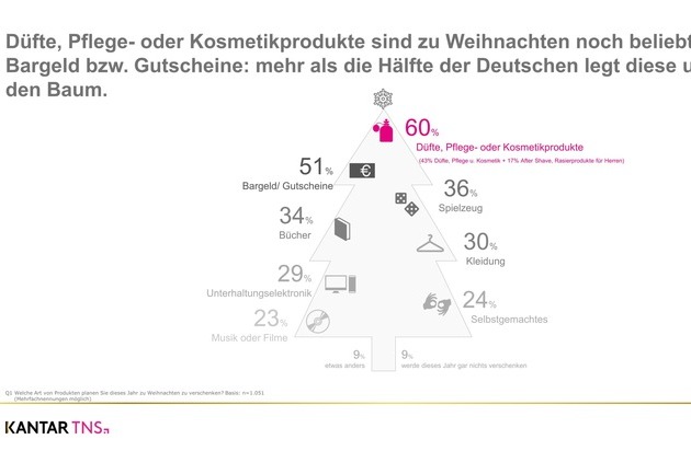 Beautyprodukte machen in diesem Jahr Bargeld und Gutscheinen den Platz unter dem Weihnachtsbaum streitig. 60 Prozent der Deutschen planen, Kosmetik oder Düfte zu verschenken und sind dabei bereit, für Weihnachtsgeschenke in dieser Kategorie in 2017 tendenziell etwas mehr Geld auszugeben. Nahezu jeder Zweite erfüllt damit zudem einen konkreten Wunsch. Das hat eine repräsentative Untersuchung von Kantar TNS und VKE-Kosmetikverband ergeben. Nur neun Prozent der Befragten wollen in diesem Jahr komplett auf Geschenke verzichten. Das sind ein Prozent weniger als im Vorjahr und nur noch knapp halb so viele wie 2015.