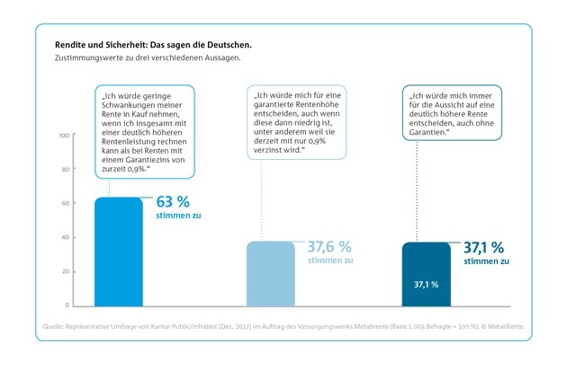 - Bei der Altersvorsorge genießen Arbeitgeber höchstes Vertrauen. - Große Mehrheit wünscht sich stärkeres Engagement der Sozialpartner bei der Alterssicherung. - Klare Mehrheit für einen Automatismus bei der Betriebsrente. Arbeitgeberzuschuss macht automatische Betriebsrente noch attraktiver. - Die Aussicht auf höhere Rentenleistung - auch bei geringen Schwankungen - ist attraktiver als die Niedrigzins-Garantie. - Kopf an Kopf: Die grundsätzliche Entscheidung für Renditechancen liegt gleichauf mit der für niedrig verzinste Garantien.