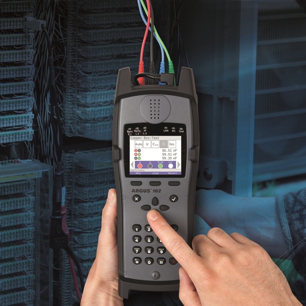 Vor allem aber in Verbindung mit der Kabelmultimetererweiterung ARGUS Copper Box zeigt der ARGUS 162 seine Leistungsfähigkeit: Um die Leitungsqualität zu messen und etwaige Fehlverkabelungen zu ermitteln, führt der Kombitester Kupfertests (Cu-Tests) durch. Darüber hinaus lässt sich der ARGUS 162 für den Inhouse-Bereich als WLAN-Access-Point konfigurieren, so dass beispielsweise Mobilgeräte des Kunden auf die in Betrieb genommene kupfer- oder glasfaserbasierte-Breitbandschnittstelle über das Testgerät zugreifen können.