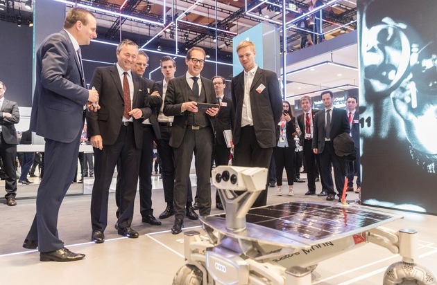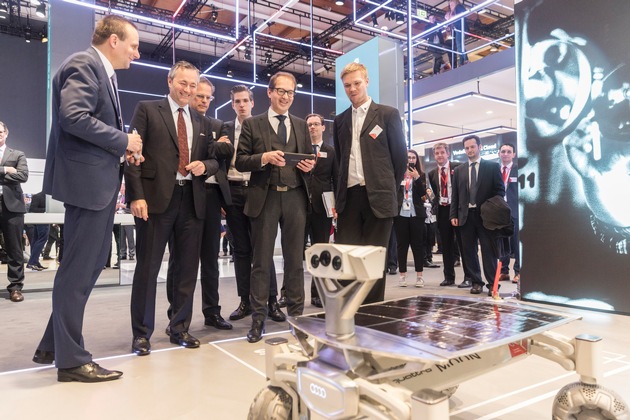 Vodafone Stand auf der CeBIT - Bundesverkehrsminister Alexander Dobrindt lässt sich auf der Messe zeigen, wie ein Start-up aus Berlin zusammen mit Vodafone und Audi Deutschlands erste Mondlandung möglich machen will. Das Ziel: Raumfähre ALINA auf dem Trabanten sicher landen, mit zwei Audi rover luna quattro den Mond erforschen - und dafür das erste LTE Netz im All aufspannen. Die Kommunikationsinfrastruktur dort oben bringt Breitband auf den Mond. Und lässt die Forscher nach erfolgreichem Raketenstart Mitte 2018 gestochen scharfe HD Bilder zur Erde senden. Unter anderem von der Landestelle der Apollo 17 Mission - und damit von dem Ort, an dem das letzte Mal vor 45 Jahren ein Mensch den Mond betreten hat. LTE liefert aber nicht nur Bilder, sondern lässt die Forscher ihre Mond-Rover vom Mission Control Center in Berlin aus präzise steuern. Mit der so genannten LTE V2X Technologie vernetzt Vodafone auf der Erde bereits die ersten Audis und bereitet so den Weg fürs autonome Fahren.