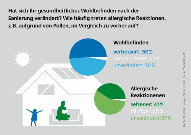 Bewohner von Effizienzhäusern sind sehr zufrieden mit den umgesetzten Effizienzmaßnahmen und loben die hohe Wohnqualität. Das belegt eine Umfrage, die die Deutsche Energie-Agentur (dena) in Zusammenarbeit mit dem Berliner Institut für Sozialforschung (BIS) unter selbstnutzenden Eigentümern von Effizienzhäusern durchgeführt hat. So würden 94 Prozent der Einfamilienhausbesitzer die umgesetzten Modernisierungsmaßnahmen weiterempfehlen. Ungefähr die Hälfte der Bewohner gibt an, dass sich ihr gesundheitliches Wohlbefinden im sanierten Effizienzhaus im Vergleich zu vorher verbessert oder deutlich verbessert hat. Bei rund 40 Prozent der Bewohner ist zudem die Belastung durch bestehende Pollenallergien deutlich zurückgegangen.