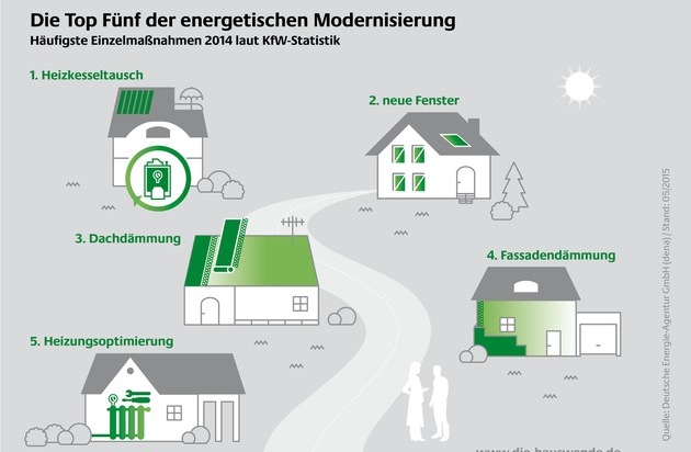 "Für Hausbesitzer mit begrenzten finanziellen Mitteln können Einzelmaßnahmen ein guter Einstieg in die schrittweise energetische Modernisierung des Eigenheims sein", sagt Christian Stolte, Experte für energieeffiziente Gebäude bei der dena. Der Austausch eines alten Heizkessels, die Erneuerung der Fenster, eine Wärmedämmung und weitere Maßnahmen können über die KfW mit einem Investitionszuschuss von bis zu 5.000 Euro pro Wohneinheit gefördert werden. Die Einbindung erneuerbarer Energien zur Warmwasserbereitung oder zum Heizen kann alternativ auch über das Bundesamt für Wirtschaft und Ausfuhrkontrolle (BAFA) bezuschusst werden.