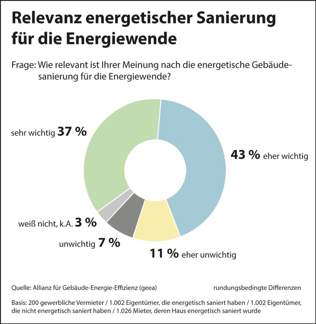 Die Energiewende wird nur mit energieeffizienteren Gebäuden erfolgreich sein - diese Tatsache ist in breiten Teilen der Bevölkerung mittlerweile fest verankert. Das ist das Ergebnis einer Umfrage, die das Institut TNS Emnid im Auftrag der Allianz für Gebäude-Energie-Effizienz (geea) zu verschiedenen Aspekten der energetischen Sanierung durchgeführt hat. Befragt wurden über 3.000 Wohnungs- oder Hauseigentümer sowie Mieter und Vermieter. Über drei Viertel der Befragten halten die energetische Gebäudesanierung für wichtig oder sehr wichtig für das Gelingen der Energiewende. Dies gilt sowohl für Personen, die bereits energetisch saniert haben, als auch für Personen, die noch keine entsprechenden Maßnahmen an ihrem Haus durchgeführt haben.