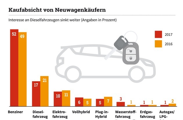 Fahrzeuge mit Dieselantrieb verlieren die Gunst der Verbraucher. Das Kaufinteresse sinkt im Vergleich zum Vorjahr weiter von 21 auf nur noch 17 Prozent. Alternative Antriebe können von dieser Entwicklung nicht profitieren: Die Kaufabsicht für Elektrofahrzeuge inklusive Hybridantriebe ist ebenfalls leicht rückläufig und sinkt um 2 Prozent auf 21 Prozent. Benziner hingegen legen um 3 Prozent zu und stoßen mit 52 Prozent auf das höchste Kaufinteresse. Das sind die Ergebnisse einer repräsentativen Umfrage der Deutschen Energie-Agentur (dena) unter potenziellen Neuwagenkäufern.