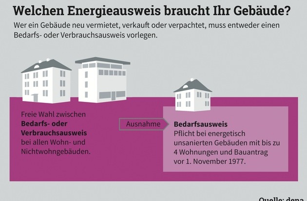 Die dena empfiehlt deshalb den Bedarfsausweis. Zur Ausstellung berechnet ein Energieberater anhand einer technischen Analyse aller Gebäudedaten den Energiebedarf und dokumentiert den energetischen Zustand des Gebäudes - unabhängig vom Nutzerverhalten. Dabei werden die Qualität der Gebäudehülle - wie Fenster, Decken und Außenwände - sowie der Heizungsanlage und des Energieträgers berücksichtigt. Der energetische Zustand des Hauses sowie mögliche Sanierungsmaßnahmen, mit denen der Zustand verbessert und der Wert der Immobilie gesteigert werden kann, lassen sich so deutlich exakter darstellen.