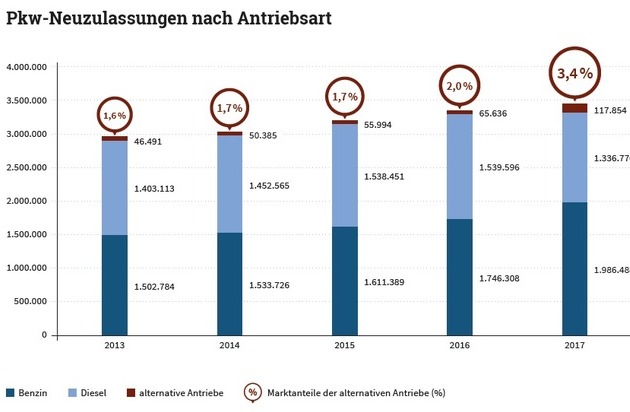 Hybrid-, Flüssiggas- und ErdgasfahrzeugenDie Nachfrage nach Pkw mit alternativen Antrieben steigt. Im ersten Quartal 2018 lag der Marktanteil von Fahrzeugen mit Elektro-, Hybrid-, Flüssiggas- oder Erdgasantrieb bei 4,7 Prozent, im Vorjahresquartal waren es 2,8 Prozent. Die Zahl der Neuzulassungen stieg im vergangenen Jahr um 80 Prozent auf insgesamt 118.000 Pkw. Der Monitoringbericht "Alternative Antriebe in Deutschland", den die Deutsche Energie-Agentur (dena) am Donnerstag veröffentlichte, führt die Entwicklung unter anderem auf die größere Auswahl an Modellen, die Diskussion um erhöhte Abgaswerte und Fahrverbote für Diesel-Pkw sowie Fördermaßnahmen wie die Einführung eines Umweltbonus für Elektro- und Hybridfahrzeuge oder die Verlängerung der Energiesteuerermäßigung für Erdgas-Pkw zurück.