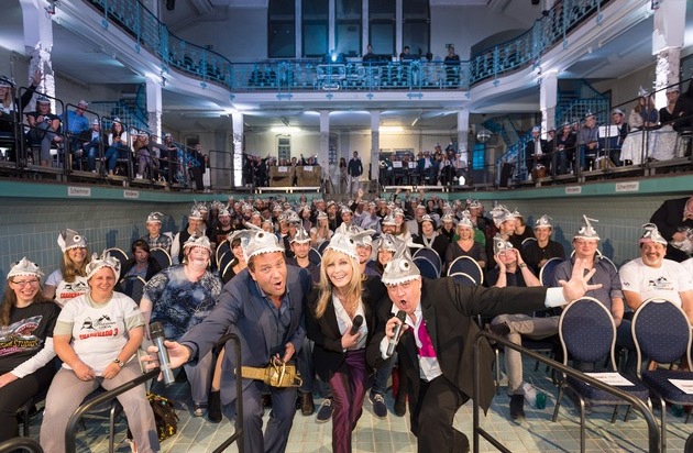 Mit einer riesen HAI-Sause auf TELE 5 und bei der Live-Kinopremiere mit Peter Rütten, Bo Derek und Oliver Kalkofe (v.l.n.r.) vor über 250 Zuschauern im "Stadtbad Steglitz" in Berlin endete am gestrigen Abend, mit dem "SchlefaZ: Sharknado 3" die Sommerstaffel der "schlechtesten Filme aller Zeiten".
