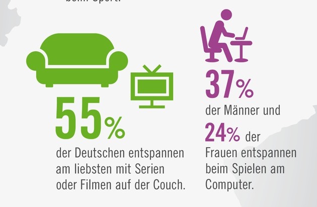 Bei den Entspannungsmethoden gibt es deutliche Unterschiede unter den Geschlechtern: Am Computer spielen ist zum Beispiel ein typisch männliches Entspannungsmittel(37 Prozent). Dagegen sorgt die Einkaufstour bei jeder vierten Frau für gute Laune und Entspannung.