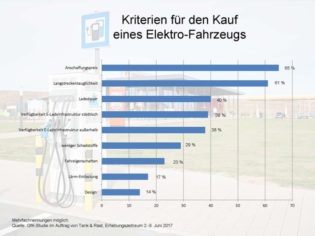 Die GfK-Erhebung gibt auch Einblick in weitere Faktoren, die neben dem Anschaffungspreis und der Langstreckentauglichkeit eines Fahrzeugs für den Kauf eines Elektro-Autos wesentlich sind: Dazu zählt die Verfügbarkeit von E-Ladestationen außerhalb von Ballungsgebieten (38%), z. B. entlang der Autobahn, sowie in städtischen Gebieten (39%). Ein wichtiges Entscheidungskriterium ist auch die Ladedauer bei Strom-Tankstopps auf Langstrecken sowie zu Hause (je 40%). Zu weiteren Aspekten der Kaufentscheidung zählen Umweltentlastung durch weniger Schadstoffe (29%). Faktoren wie Fahreigenschaften (23%) oder Design (14%) eines E-Autos fallen weniger ins Gewicht.
