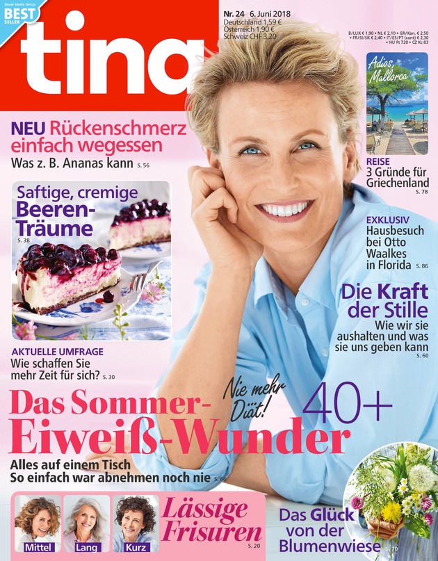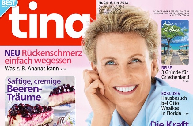 tina ist Qualitätsmarktführer der wöchentlichen Frauenzeitschriften für die Zielgruppe Frauen 40plus. Als Begründerin des Segmentes ist tina das Original im Weekly-Markt und positioniert sich seit 40 Jahren leistungsstark in Auflage (369.974 verk. Expl., IVW 2018/I) und Reichweite (2,56 Mio., MA 2017/II). Die hochwertige Optik und journalistische Exzellenz zieht sich durch alle redaktionellen Kernsäulen: Fashion & Beauty, Gesundheit & Wohlbefinden, Kochen & Backen - inszeniert durch aufwendig produzierte Themenstrecken. Durch ihr einzigartiges Zielgruppen-Know-how präsentiert tina jede Woche Themen von höchster Relevanz und Aktualität. Zur tina Markenwelt gehören tina Woman, tina Gesund & Fit, tina Koch- & Back-Ideen und tina Backen.