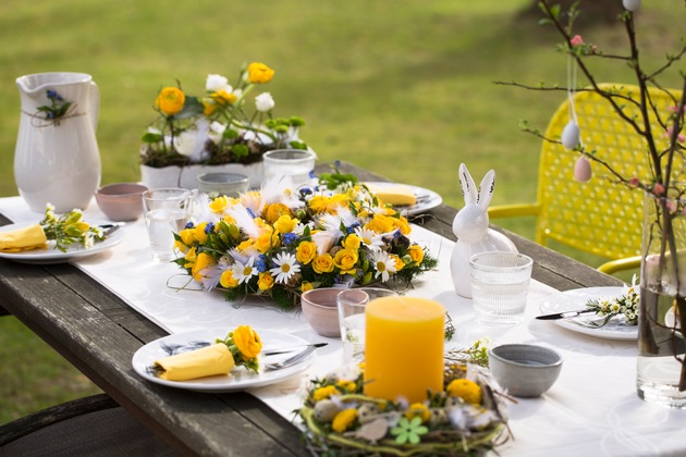 Im Frühling wird es in der Blumenwelt bunt. Frühjahrsblüher wie Tulpen, Narzissen und Hyazinthen sind in vielen Farben im Floristikfachgeschäft erhältlich. "Zur Osterfloristik gehören für mich unbedingt auch Ranunkeln, Freesien und Vergissmeinnicht", so die Floristmeisterin aus Ettlingen in Baden-Württemberg. Die klassische Farbe an Ostern ist natürlich Gelb. In Kombination mit weißen und blauen Farbtupfern strahlen gelbe Blüten besonders schön. Ein absolutes Highlight auf der Festtagstafel ist der klassische Osterkranz oder ein großer Osterstrauß. Im Trend sind locker und leicht gebundene Arrangements - als ob die Blumen eben frisch von der Wiese gepflückt wurden seien. "Dezente Blumengestecke aus zarten saisonalen Blüten und Naturmaterialien wie Holz, Moos, Wachteleiern und Federn wirken besonders harmonisch", verrät die bekannte TV-Floristin. Aber auch frühlingshafte Zweige von Weidenkätzchen, Forsythien und Quittenbäumen eignen sich wunderbar für eine florale Dekoration an Ostern. Akzente setzt man mit einzelnen Blüten in kleinen Vasen oder in der Serviette drapiert. Auf einer hellen Tischdecke kommen die farbenfrohen Blumenkreationen besonders zur Geltung. Mit diesen tollen Deko-Ideen bringt man seine Gäste beim Osterbrunch sicher zum Staunen.