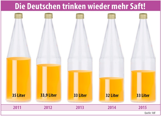 Nach den aktuellen Zahlen der Gesellschaft für Konsumforschung (GfK) haben die Deutschen 2015 erstmals seit Jahren wieder mehr Fruchtsaft und Fruchtnektar getrunken und damit den mehrjährigen Abwärtstrend im Pro-Kopf-Verbrauch gestoppt. Insgesamt wurde ein ganzer Liter mehr konsumiert als im Jahr zuvor und so rechnet der Verband mit einem Anstieg des Pro-Kopf-Verbrauchs von 32 Litern im Jahr 2014 auf 33 Litern in diesem Jahr. Insbesondere hochwertige Direktsäfte bauen ihren Marktanteil kontinuierlich aus. Gekühlte Direktsäfte und regionale Streuobstsäfte haben den Verbrauchern ebenfalls wieder mehr Lust auf das natürliche Lebensmittel Saft gemacht.