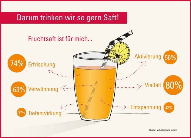 Für die meisten Verbraucher sind Fruchtsäfte mehr als nur ein einfaches Getränk. Dank ihrer Sorten- und Geschmacksvielfalt können sie ganz unterschiedliche Bedürfnisse und Befindlichkeiten bedienen. Ob herb-säuerlich, klar und spritzig oder samtig-süß: Für jede Tageszeit und fast jeden Anlass gibt es den passenden Fruchtsaft. Genau diese Vielfalt und Funktionalität schätzen Verbraucher ganz besonders an Fruchtsäften, wie eine aktuelle Studie des rheingold institut ergab.