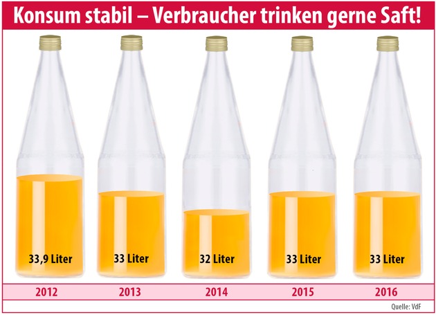 Nach den aktuellen Zahlen der Gesellschaft für Konsumforschung GfK ist der Fruchtsaftkonsum nach einem mehrjährigen Abwärtstrend seit 2015 stabil. Insgesamt liegt der Pro-Kopf-Konsum auch im Jahr 2016 wieder bei 33 Litern. Innerhalb des Fruchtsaftsegments konnten insbesondere die hochwertigen Direktsäfte ihren Marktanteil kontinuierlich ausbauen. Direktsäfte und regionale Streuobstsäfte haben den Verbrauchern verstärkt Lust auf das natürliche Lebensmittel Saft gemacht. Der Trend zu hochwertigen Fruchtsäften trägt mit dazu bei, dass die Branche ihren Umsatz insgesamt um 2 Prozent steigern konnte.