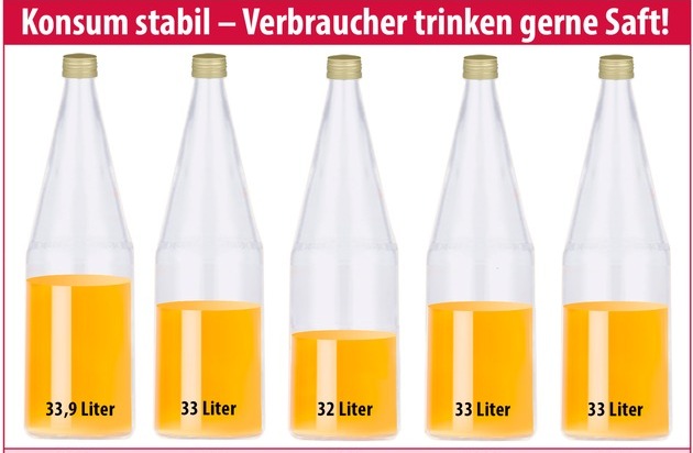 Nach den aktuellen Zahlen der Gesellschaft für Konsumforschung GfK ist der Fruchtsaftkonsum nach einem mehrjährigen Abwärtstrend seit 2015 stabil. Insgesamt liegt der Pro-Kopf-Konsum auch im Jahr 2016 wieder bei 33 Litern. Innerhalb des Fruchtsaftsegments konnten insbesondere die hochwertigen Direktsäfte ihren Marktanteil kontinuierlich ausbauen. Direktsäfte und regionale Streuobstsäfte haben den Verbrauchern verstärkt Lust auf das natürliche Lebensmittel Saft gemacht. Der Trend zu hochwertigen Fruchtsäften trägt mit dazu bei, dass die Branche ihren Umsatz insgesamt um 2 Prozent steigern konnte.