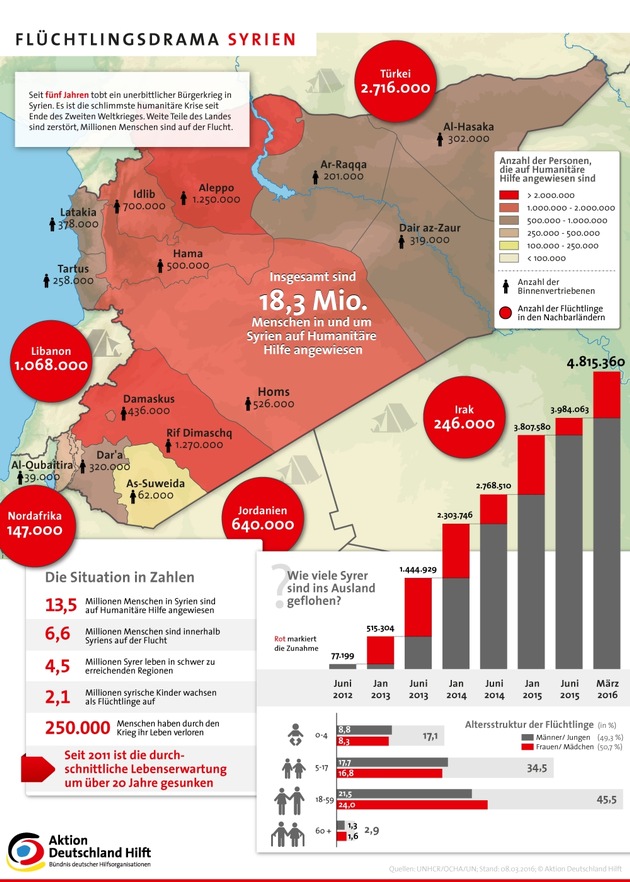 Zum fünften Jahrestag der Syrien-Krise blickt das Bündnis nicht nur auf das Land selbst, sondern auch auf die vom Konflikt Betroffenen außerhalb Syriens. "Natürlich sind die Umstände hier in Flüchtlingscamps in Griechenland bei den täglich zu bewältigenden Menschenmassen als katastrophal zu bezeichnen", berichtet Edith Wallmeier, Vorstand Aktion Deutschland Hilft und Leiterin der Auslandshilfe des Arbeiter-Samariter-Bunds aus Idomeni, Griechenland. "Allerdings funktioniert nach meinen Beobachtungen die Grundversorgung. Was aber die Menschen quält und unhaltbar ist: Sie fragen sich, wie lange sie ausharren müssen, wann und wohin es weiter geht. Daher ist auch die Vertagung des Flüchtlingsgipfels schlimm für die Menschen - jeder Tag, an dem es keine Lösung für die Flüchtenden gibt, vergrößert das Leiden."