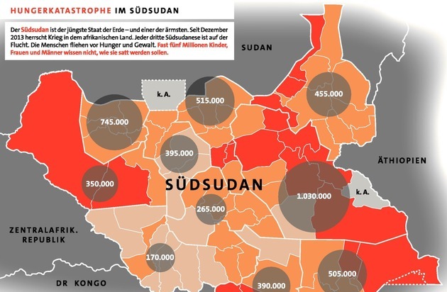 Das Bündnis "Aktion Deutschland Hilft" warnt davor, dass sich die verheerende Hungersituation weiter zuspitzt. Neben einem erschwerten Zugang fachen ausbleibende Ernten, der Flächenbrand der Gewalt und extrem steigende Lebensmittelpreise die Not weiter an. Über zwei Millionen Südsudanesen haben ihr Heimatland verlassen, die Hälfte von ihnen beginnt in Uganda ein neues Leben. Das südliche Nachbarland nimmt die Menschen mit einer beispiellosen Willkommenskultur auf: Sie erhalten Land, Unterstützung und können ihre Kinder zur Schule schicken. "Hier wächst ohne weiteren Einsatz eine verlorene Generation heran", warnt Roßbach. Doch in Uganda finden die Männer, Frauen und Kinder etwas, das ihnen im Südsudan seit vier Jahren verwehrt wird: Frieden.