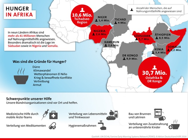 "Die Entbehrungen in vielen Ländern Afrikas sind immens und stellen uns auch in diesem Jahr vor besondere Herausforderungen", sagt Manuela Roßbach, geschäftsführender Vorstand von "Aktion Deutschland Hilft". Das Thema sei zwar weitestgehend aus den Medien verschwunden. "Die Krise ist jedoch längst nicht überstanden und kann nur überwunden werden, wenn die kriegerischen Auseinandersetzungen endlich ein Ende haben", so Roßbach weiter. "Hier ist auch die deutsche Politik gefragt, den Friedensprozess, beispielsweise im Südsudan, weiter voranzubringen."
