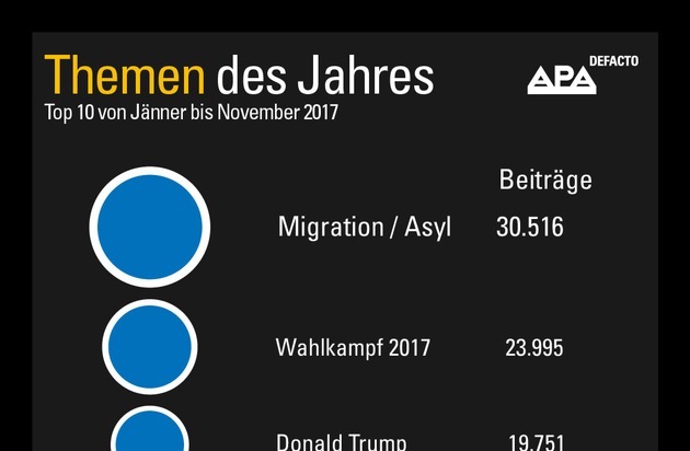 Der Themenbereich Migration/Asyl verlor während des Jahres weiter an Aufmerksamkeit, im November 2017 fiel die Zahl der Nennungen wieder auf das Niveau von vor 2015. "Zwar verbuchte das Thema erneut die meisten Artikel im APA-DeFacto-Jahresrückblick, gegenüber dem Vorjahr (62.659 Beiträge) zeigte sich allerdings eine Halbierung", erläutert Medienanalyst Manuel Kerzner.