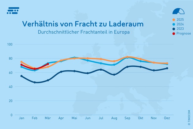 Für das erste Quartal 2026 erwartet TIMOCOM einen insgesamt stabilen, aber von saisonalen Schwankungen geprägten Transportmarkt in Europa. Gegenüber Dezember folgt im Januar zunächst nur ein leichter Rückgang auf etwa 71 % Frachtanteil, im Februar geht es im typischen Saisontief mit ca. 65 % aber nochmal deutlich nach unten, bevor die Frühjahrsbelebung für einen durchschnittlichen Frachtanteil von 72 % im März sorgt.