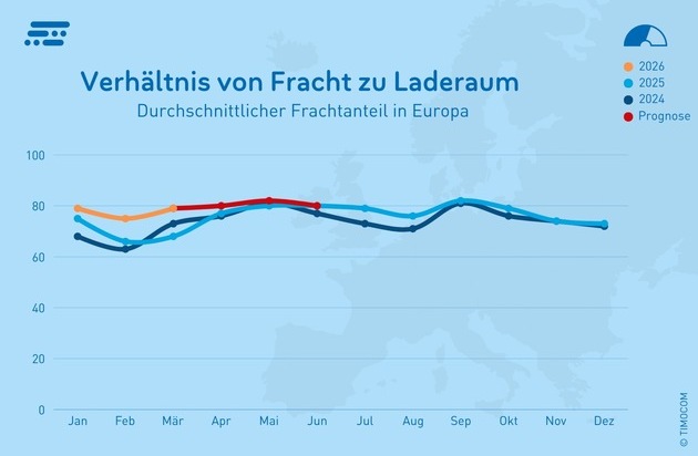 In einer optimistischen Prognose von TIMOCOM, die von einer Entspannung der Situation in den nächsten Wochen ausgeht, wird sich der Frachtanteil im April nur leicht verändern und bei ca. 80 % liegen. Im Mai wird er bedingt durch die kurzen Feiertagswochen leicht ansteigen (82 %) und damit das Vorjahresniveau minimal überschreiten. Im Juni wird der Frachtanteil voraussichtlich nicht unter 80 % fallen.