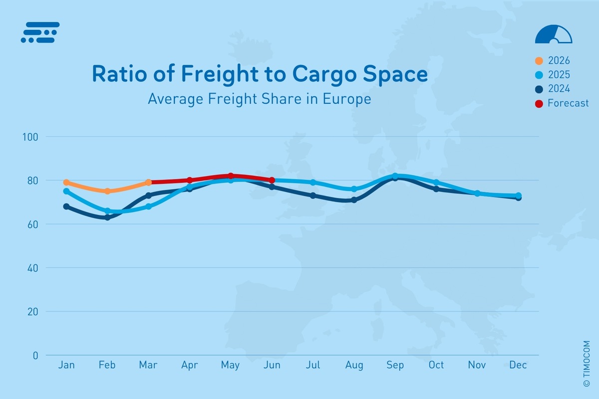 Innerhalb Deutschlands war die Entwicklung ähnlich: In Q1 2026 wurden insgesamt 37 % mehr Frachtangebote gezählt als im Vorjahresquartal. Der Frachtanteil lag mit 68 % im traditionell sonst eher ausgeglicheneren Februar 7 Prozentpunkte über dem Vorjahreswert und stieg im März um 9 Prozentpunkte gegenüber März 2025 auf 77 %.