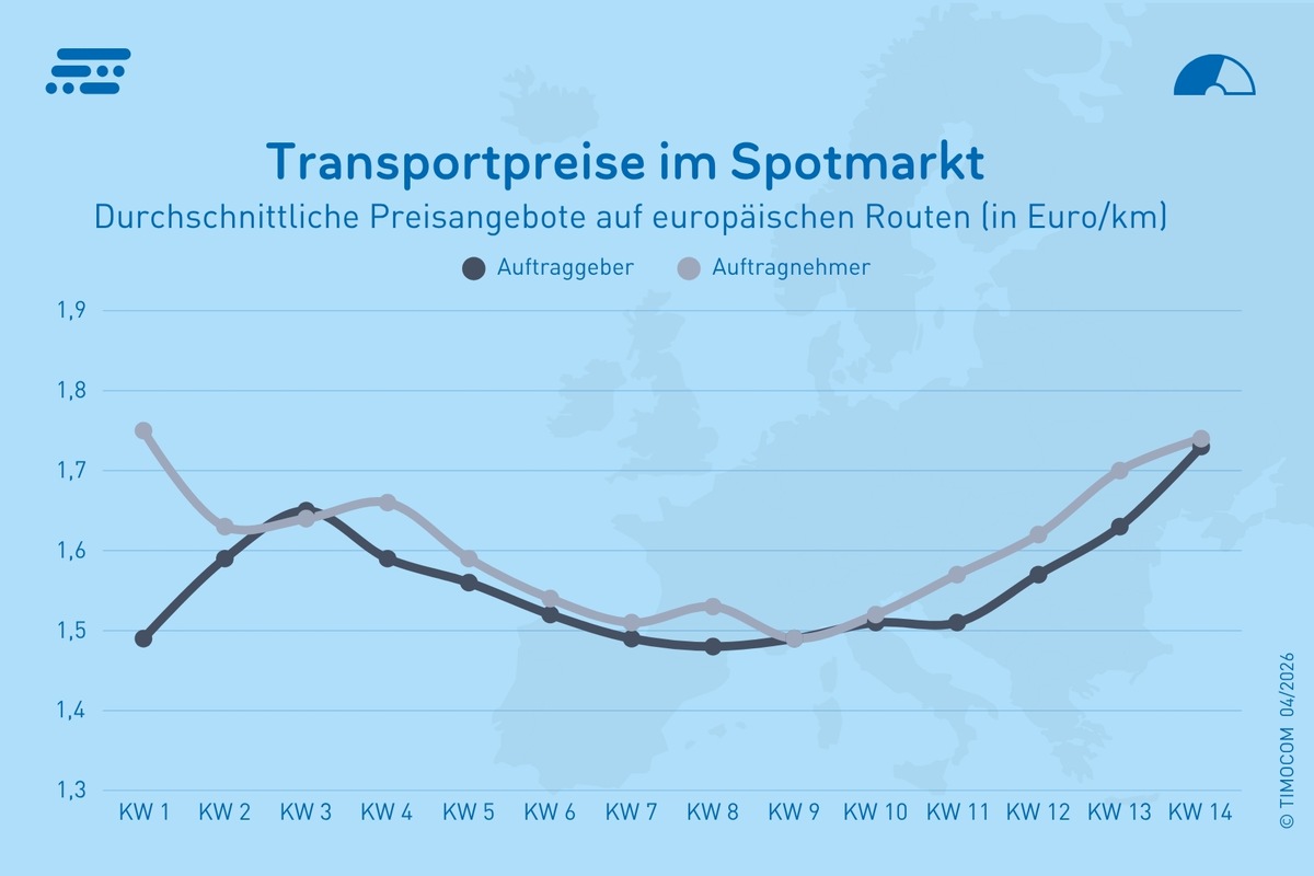Zu Jahresbeginn sanken die europäischen Spotmarktpreise gegenüber dem Jahreswechsel nochmal deutlich. Mit zunehmender Spannung des Konflikts im Nahen Osten wurde ein erneuter Anstieg bei den Preisvorschlägen sichtbar, der im März von Woche zu Woche zulegte. Auftragnehmer forderten auf europaweiten Routen im Schnitt 9,5 % höhere Kilometerpreise als im Vorjahresquartal, während die Auftraggeber durchschnittlich 8,9 % mehr boten. Die wöchentlichen Durchschnittspreise reichten so von 1,48 €/km bis 1,75 €/km.