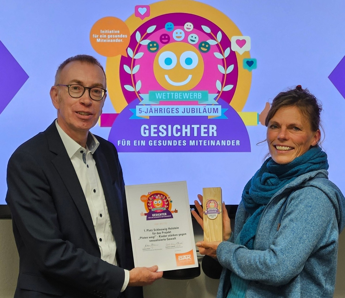 „Gesichter für ein gesundes Miteinander“: Unter diesem Motto haben bundesweit rund 500 Projekte und Initiativen an einem Wettbewerb für besonderes Gesundheitsengagement teilgenommen. In Schleswig-Holstein gewann in diesem Jahr die Initiative „Pfoten weg!“ aus Großharrie im Kreis Plön. Platz zwei ging an das Projekt „Wellcome Schleswig-Holstein“ von Julia Wilkens. Den dritten Platz belegte das Projekt „Klönschnack im Amt Eiderkanal“ im Kreis Rendsburg-Eckernförde. Die DAK-Gesundheit zeichnete gestern die Gewinnerinnen und Gewinner aus.