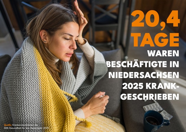 Der Krankenstand in Niedersachsen ist 2025 im Vergleich zum Vorjahr leicht gestiegen (2024: 5,5 Prozent). DAK-versicherte Beschäftigte waren durchschnittlich an 20,4 Kalendertagen krankgeschrieben und hatten demnach annährend so viel Arbeitsausfall wie im Vorjahr. Die meisten Fehltage gingen auf das Konto von psychischen Erkrankungen. Sie verursachen 13,2 Prozent mehr Fehltage als 2024. Weitere wichtige Ursachen waren Muskel-Skelett-Erkrankungen auf Rang zwei und Atemwegsinfekte auf Rang drei. Insgesamt pendelt sich der Krankenstand in Niedersachsen auf einem hohen Niveau ein. Deshalb fordert die DAK-Gesundheit eine fundierte Ursachenforschung. Arbeitgeber, Gewerkschaften, Ärzteschaft und Krankenkassen sollten gemeinsam an einen Tisch kommen, um neue Lösungswege zu entwickeln und auch ein gesundes Arbeitsumfeld in den Fokus zu rücken.