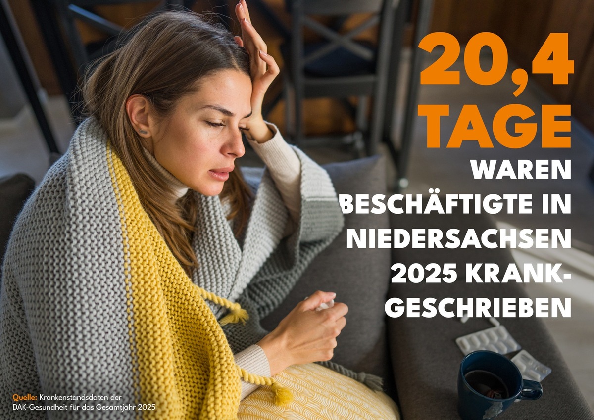 Niedersachsen: Beschäftigte im Durchschnitt an 20,4 Tagen krankgeschrieben