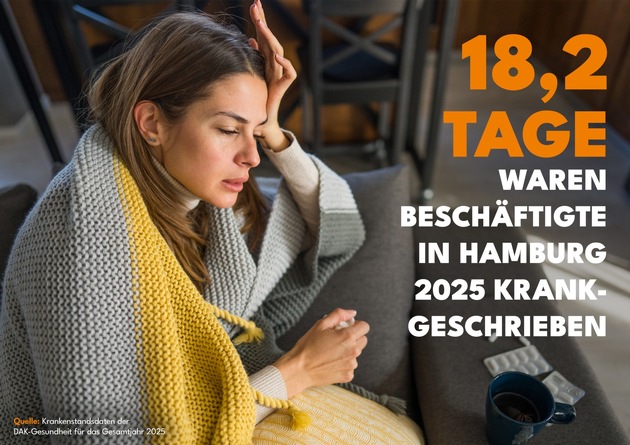 Der Krankenstand in Hamburg ist 2025 im Vergleich zum Vorjahr stabil geblieben. DAK-versicherte Beschäftigte waren durchschnittlich an 18,2 Kalendertagen krankgeschrieben und hatten demnach genauso viel Arbeitsausfall wie im Vorjahr. Die meisten Fehltage gingen auf das Konto von psychischen Erkrankungen. Sie verursachen 6,2 Prozent mehr Fehltage als 2024. Weitere wichtige Ursachen waren Atemwegsinfekte auf Rang zwei und Muskel-Skelett-Erkrankungen auf Rang drei. Insgesamt pendelt sich der Krankenstand in der Hansestadt auf einem hohen Niveau ein. Deshalb fordert die DAK-Gesundheit eine fundierte Ursachenforschung. Arbeitgeber, Gewerkschaften, Ärzteschaft und Krankenkassen sollten gemeinsam an einen Tisch kommen, um neue Lösungswege zu entwickeln und auch ein gesundes Arbeitsumfeld in den Fokus zu rücken.