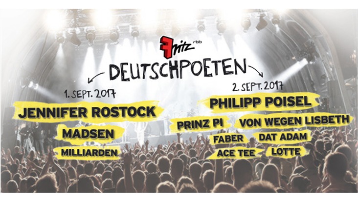 Schon seit 2010 präsentiert Fritz, das junge Radio vom rbb, mit dem Format "Fritz DeutschPoeten" etablierte Künstler und junge Talente der deutschsprachigen Musikszene. So fördert Fritz kontinuierlich und nachhaltig die deutsche Musikkultur - jenseits kommerzieller Interessen. In den Vorjahren traten bei den Fritz DeutschPoeten Cro, Jan Delay, Fettes Brot, Sido, AnnenMayKantereit, Philipp Poisel, Marteria, Kraftklub, Bilderbuch, Wir sind Helden, Tim Bendzko, Bosse, MIA., Madsen, Max Herre, Thees Uhlmann, Andreas Bourani, Wanda und viele weitere Stars auf und begeisterten bis zu 13.000 Fans.